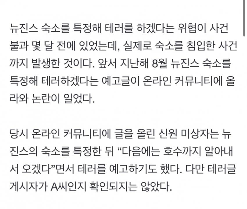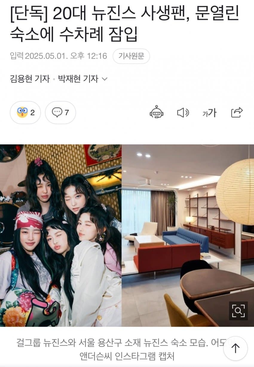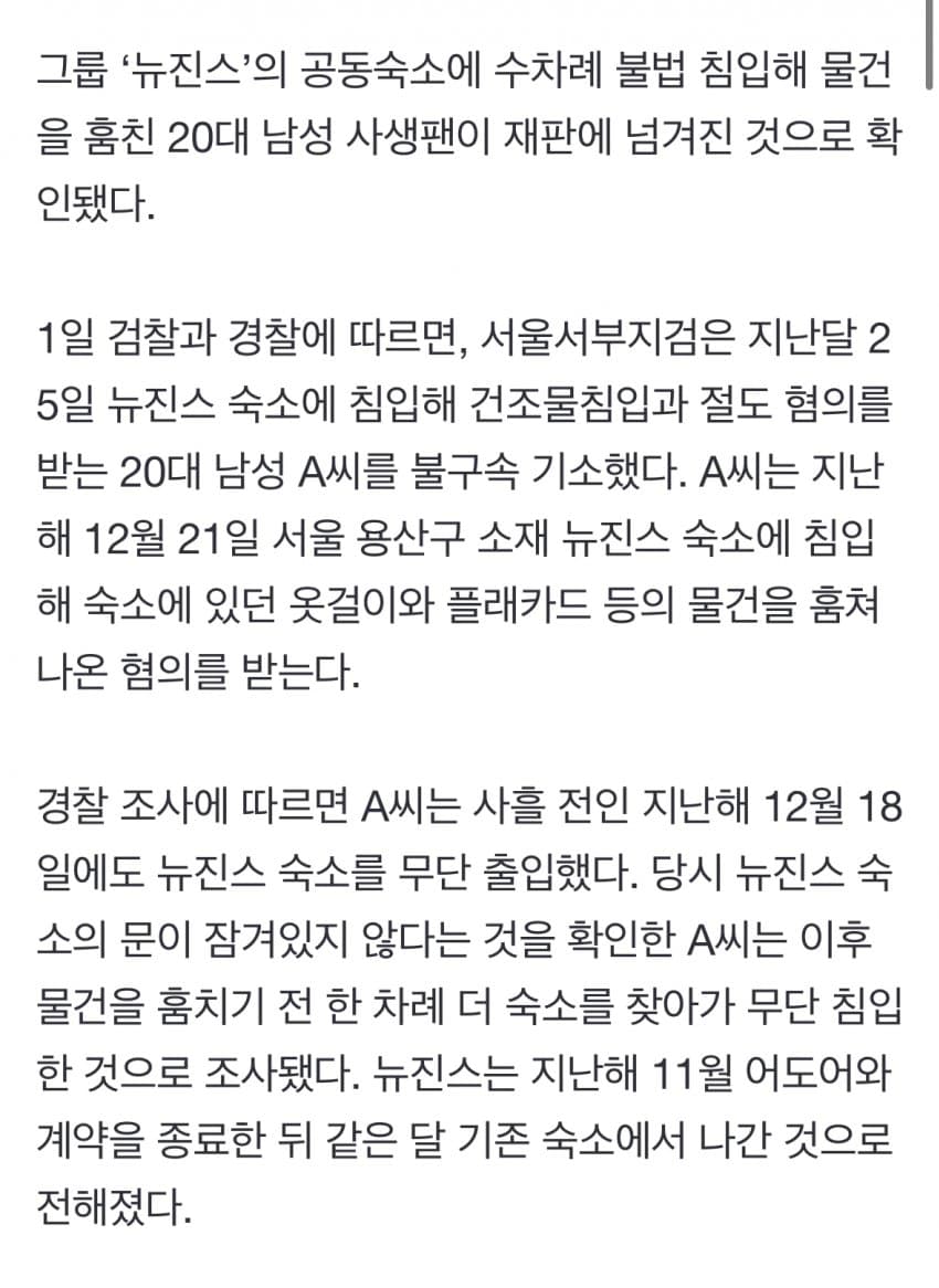 [단독] 20대 뉴진스 사생팬, 문열린 숙소에 수차례 잠입